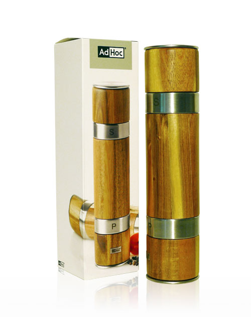 Eine wunderschöne Doppelmühle für Salz und für Pfeffer. Sie besticht durch Eleganz und Leichtigkeit. Der breite Edelstahlring unterstreicht die Eleganz und lässt das Akazienholz noch edler wirken.