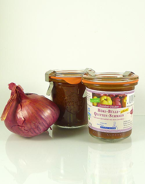 Ein wahrer Gaumenschmaus ist diese süßsaure Spezialität mit der Höri-Bülle (Zwiebel) vom Bodensee. Hier wird diese ursprüngliche Knolle mit Apfelsaft, Apfel-Balsamessig, Apfelessig, frischem Thymian und einem Hauch Peperoni eingemacht. Der Höri-Bülle-Schmaus hat eine dezente Schärfe und schmeckt wunderbar zu Gebratenem, zu Käse- und Fleischgerichten oder auch als kalte Beilage zu Käse- und Wurstspezialitäten.