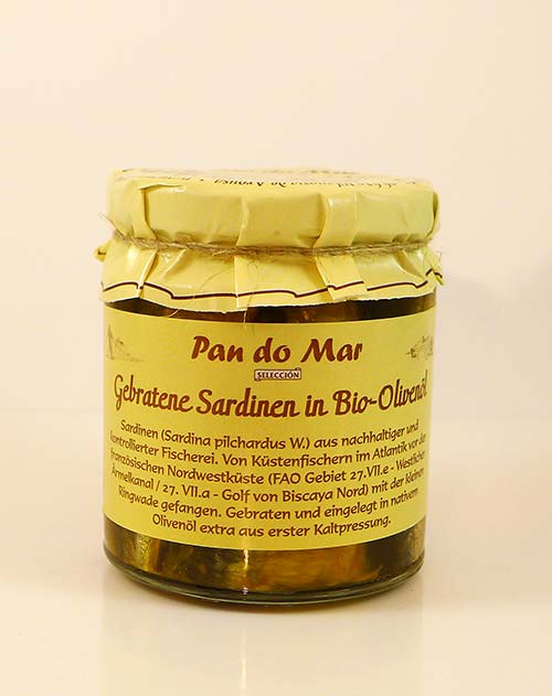 Die Sardinen (Sardina pilchardus W.) stammen aus nachhaltiger und kontrollierter Fischerei. Sie werden von Küstenfischern im Atlantik vor der südfranzösischen Nordwestküste (FAO Gebiet 27.VII-e – Westlicher Ärmelkanal/FAO Gebiet 27.VII.a – Golf von Biscaya Nord) mit der kleinen Ringwade gefangen. Die Sardinen sind von ausgezeichneter Qualität. Eingelegt werden sie in nativem BIO-Olivenöl extra aus erster Kaltpressung – und das schmeckt man auch!