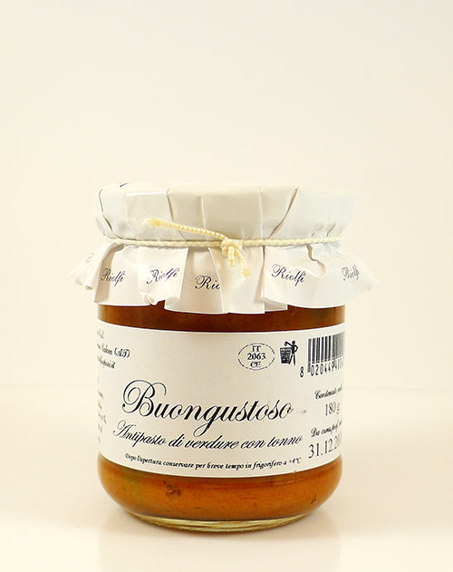 Dieses hervorragende Antipasto aus erntefrischem Gemüse und Thunfisch kommt aus dem Piemont. Das Gemüse wird von regionalen Bauern angebaut. Bei Zimmertemperatur entfaltet sich das volle Aroma der erstklassigen Zutaten und ihr herzhafter Geschmack.