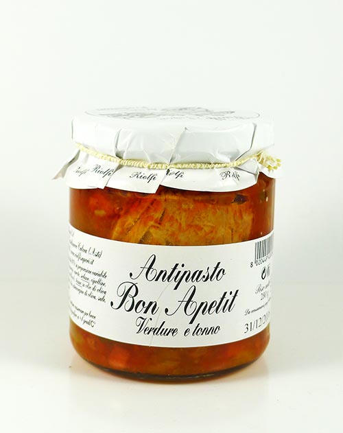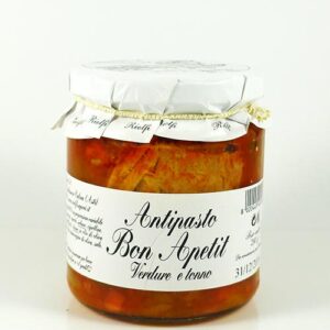 Diese hervorragende Vorspeise wird aus erntefrischem Gemüse hergestellt und mit kaltgepresstem Olivenöl, Oliven, Gewürzen und Thunfisch verfeinert. Die Zutaten sind ganz typisch fürs Piemont, einmal quer durch den Garten. Bei Zimmertemperatur entfaltet sich das volle Aroma.