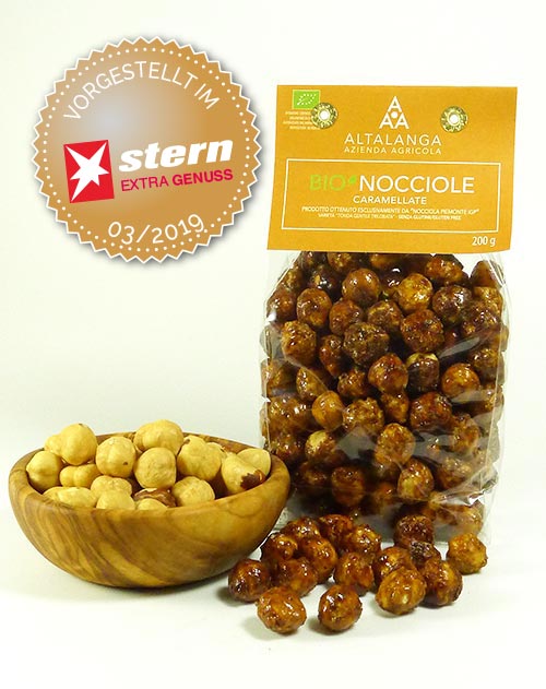 Herrlich: BIO-Haselnüsse IGP von Altalanga im piemontesischen Alba, sanft geröstet und mit einer dünnen Schicht karamellisierten Rohrohrzuckers umhüllt. Ein süßer Genuss zu einem Espresso oder einfach für zwischendurch!