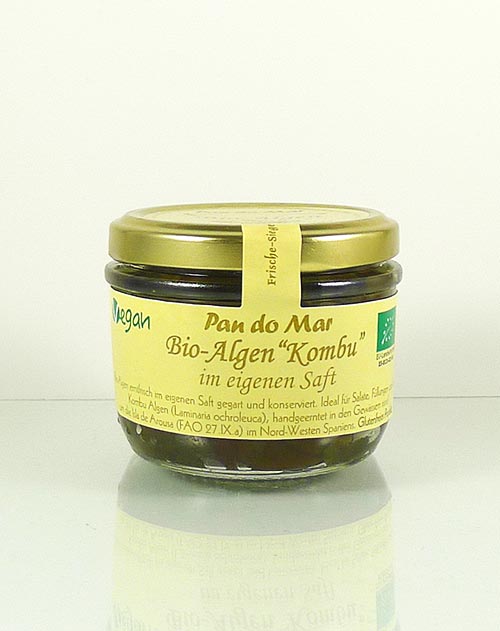 Kombu sind erntefrische, im eigenen Saft gegarte und konservierte Bio-Algen. Ideal für Salate, Füllungen und Sushi. Kombu-Algen (Laminaria ochroleuca), handgeerntet in den Gewässern rund um die Isla de Arousa (FAO 27.iX.a) im Nord-Westen Spaniens.
