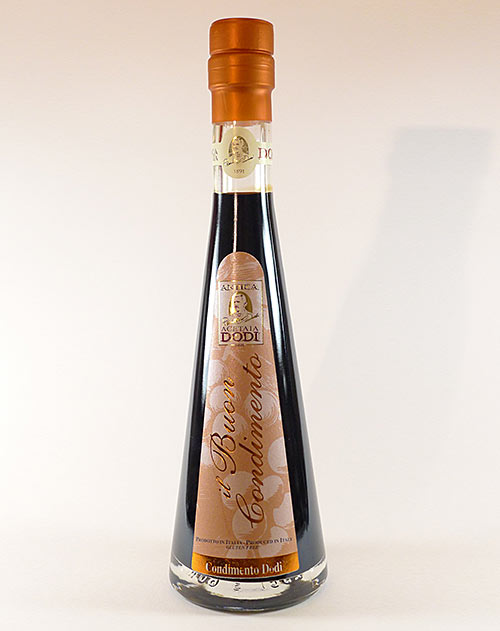 Dieser dunkle Aceto Balsamico di Modena kommt aus der Region Emilia-Romagna. Er wurde im Traditionshaus Acetaia Dodi hergestellt.
