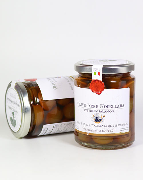 Diese herrlichen Oliven nehmen ein Bad in den bester Salzlake. Beim Genießen präsentieren sich die so eingelegten schwarzen Nocellara-Oliven mit ihrem typisch intensiven Aroma.