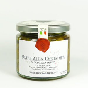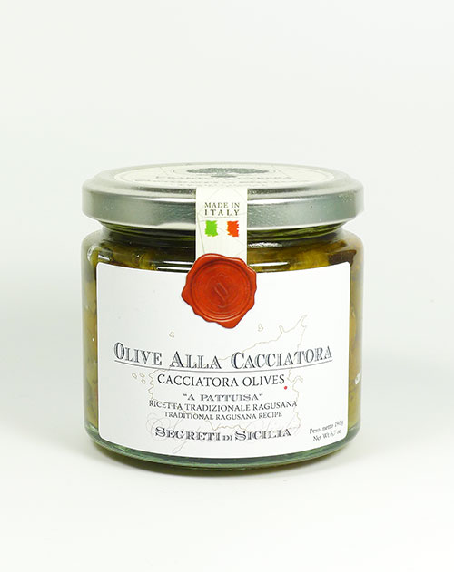 In erstklassigem nativen Olivenöl extra, Weinessig, gebratenen Zwiebeln und Kapern eingelegte Nocellara-Oliven (mit Stein!) nach Jägerart aus Sizilien