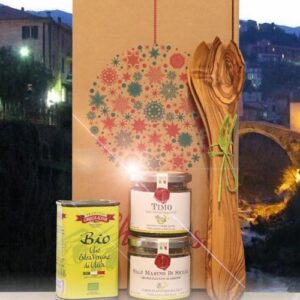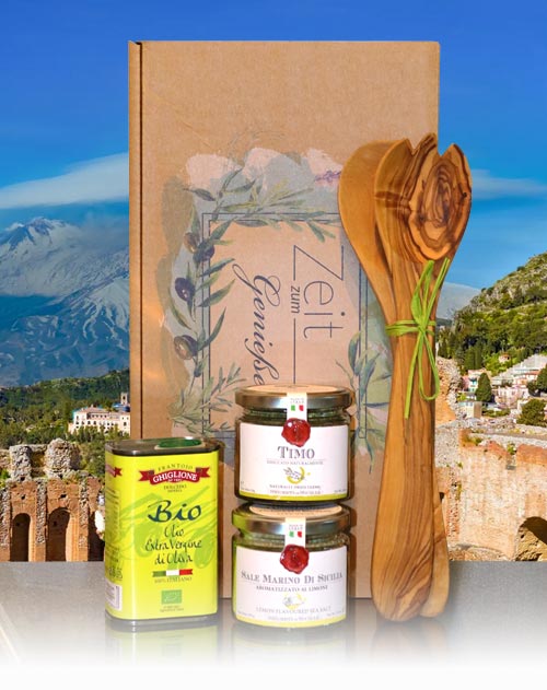 Olivenholz-Salatbesteck, BIO-Olivenöl aus Ligurien, sizilianisches Limonen-Meersalz und Ibleo-Thymian: