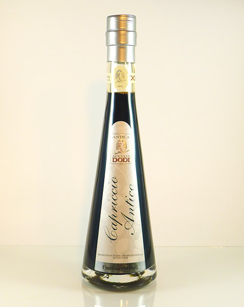 Der Capriccio Antica (früher: "Il Capriccio di Valeria") aus der Emilia-Romagna ist mindesens 8 Jahre in verschiedenen Holzfässern gereift. Er hat eine ausgezeichnete Fruchtnote, seine Konsistenz ist sirupartig, der Geschmack anhaltend süßsauer mit einer Holznote. Er eignet sich vorzüglich zum Verfeinern edelster Speisen.