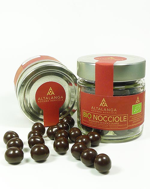 BIO-Haselnüsse, überzogen mit BIO-Zartbitter-Schokolade von Altalanga aus dem Piemont.