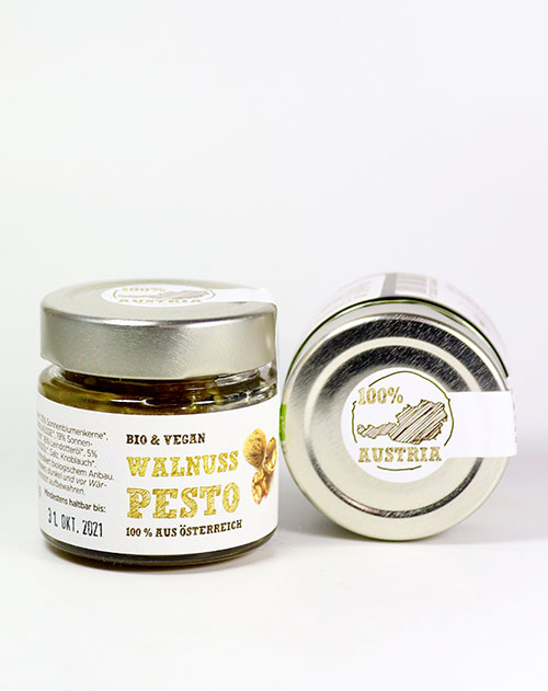 Ein Bio Walnuss Pesto, dass nach Walnüssen schmeckt, gesund ist und vegan. Das war das Ziel der Schalk Mühle und das wurde auch umgesetzt. 100% Zutaten aus Österreich und somit auch beste Bio Walnüsse aus Österreich, geben diesem köstlichen Pesto einen ganz intensiven Geschmack. Es passt genial zur schlichten Pasta, natürlich zu vielen Nudelgerichten oder auch einfach aufs Brot oder zu Käse. Oder probieren Sie es einmal im Kartoffelsalat.