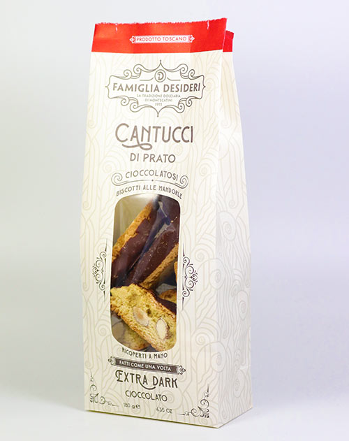 Cantucci di Prato von der Famiglia Desideri wird nach traditionellem Rezept ohne Butter hergestellt und seine Einzigartigkeit liegt in der Auswahl der hochwertigen Zutaten: bestes Mehl, 30 % Mandeln, italienischer Zucker, frische Eier, Wildblumenhonig und Orange. Diese werden zwar mechanisch gemischt, aber der Teig wird streng nach Tradition von Hand verarbeitet, Laib für Laib. Dasselbe gilt für den Schnitt von Hand, Cantucci für Cantucci, wie es seit vier Generationen getan wird. Diese Art der Verarbeitung ist ein charakteristisches Merkmal von Cantucci dei Desideri. Sie verleiht den Cantucci eine größere Weichheit und macht sie somit angenehm am Gaumen. Ein echtes Vergnügen für Naschkatzen, die gerne eintauchen. Und hier in der Variante für alle Schokoladen-Fans zusätzlich von Hand in Zartbitter-Schokolade getaucht, um sie mit dem intensiven Geschmack von dunkler Schokolade zu vereinen. Eine besondere Empfehlung zu Tee oder Kaffee.