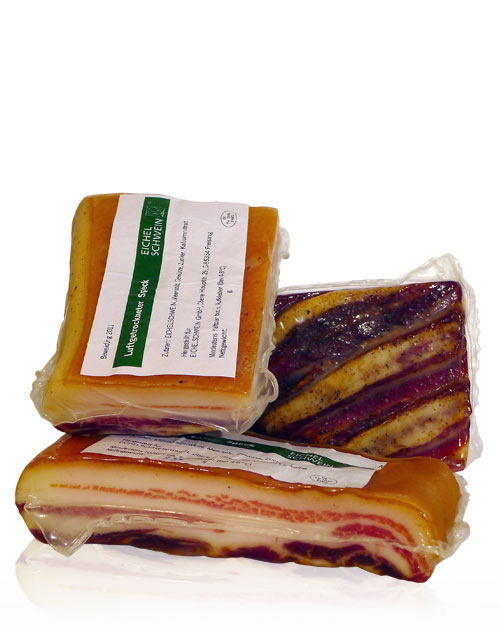 Genießen Sie den Eichelschwein-Speck zur Brotzeit oder zum Verfeinern von Speisen. Sie werden begeistert sein!