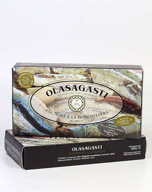 Die eingelegten gebratenen Sardellen von der Bizkaia sind ein besonderer Genuss. Durch das relativ große Volumen der Konservendosen wird der Inhalt bis zum Öffnen der Dose permanent im Einlegesud gewälzt. Das verleiht den Sardellen von Conservas Olasagasti einen einzigartigen Geschmack. Diese ungewöhnliche Art der Verpackung hat sich das Unternehmen sogar patentieren lassen. Genießen Sie die Anchoas a la Donostiarra mit einem knusprig frischen Baguette – einfach herrlich!