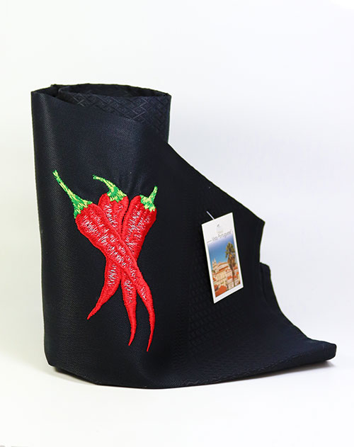 Fruchtbarer Boden und das Meer vor der Haustür sichern das tägliche Auskommen der Küstenbewohner. Grund genug, dem Reichtum der Natur – wie auf diesem hochwertig im Diamantmuster gewebten Jacquardtuch mit handgesticktem Chili-Motiv – zu huldigen. Diese hochwertigen Handtücher werden von einem kleinen Familienbetrieb im Norden Portugals handgestickt.