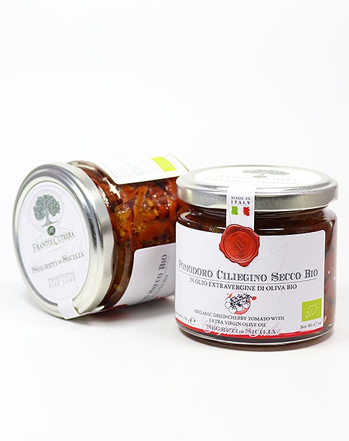 Die Familie Cutrera legt die getrockneten BIO-Kirschtomaten in ihrem erstklassigen sortenreinen nativem Bio-Olivenöl extra ein, veredelt mit rotem Knoblauch, Basilikum und wildem Oregano – natürlich aus Sizilien. Ein einzigartiges Aroma erwartet Sie. Genießen Sie die Pomodoro Ciliegino secco als Antipasti, zu Bruschetta, einfach so zum Brot, zu gebratenem Fleisch, gegrilltem Fisch oder zu Nudelgerichten.