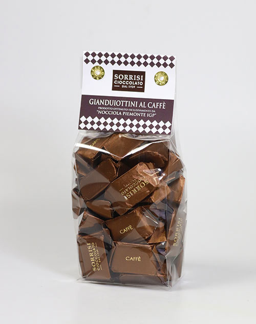 Gianduiottini al Cafe sind herrliche piemonteser Nougat-Pralinen – eine Spezialität aus Turin – verfeinert mit Kaffee. Das volle Aroma dieser erstklassigen Praline entfaltet sich, wenn Sie die Gianduiottini al Cafe bei Zimmertemperatur genießen und sie langsam im Mund schmelzen lassen.