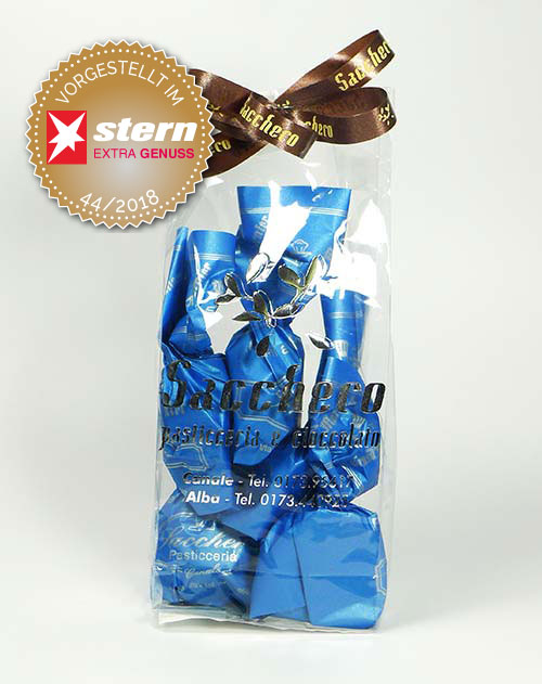 Der Patissier Guiseppe Sacchero aus dem kleinen Örtchen Canale im Piemont weiß inzwischen wohl nicht mehr, wo er seine Auszeichnungen hinhängen soll, er erhält sie regelmäßig für seine Törtchen, Pralinen oder das italinische Nationalgebäck Panettone Tradizionale. Bislang unprämiert, weil eine recht neue Schöpfung: seine erstaunlichen Grand-Marnier-Pralinen. Zwei Mürbteiggebäck-Plättchen schützen die Orangenlikörfüllung, umschlossen werden sie von bester Vollmilchschokolade. Ihr Genuss ist wie eine gelungene Meditationsübung – man fühlt sich federleicht und doch ganz erfüllt.”