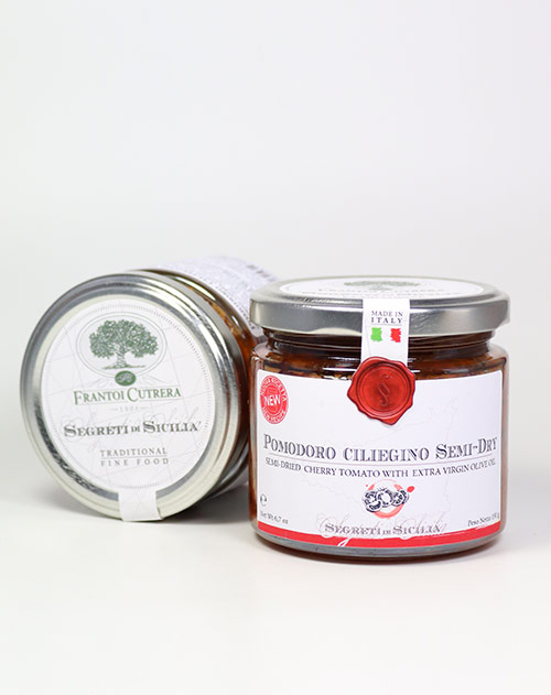 Die Familie Cutrera legt die halbgetrockneten Tomaten in ihrem erstklassigen sortenreinen nativem Olivenöl extra ein, veredelt mit rotem Knoblauch, Basilikum und wildem Oregano – natürlich aus Sizilien. Ein einzigartiges Aroma erwartet Sie. Genießen Sie die Pomodoro ciliegino semi secco als Antipasti, zu Bruschetta, einfach so zum Brot, zu gebratenem Fleisch, gegrilltem Fisch oder zu Nudelgerichten.