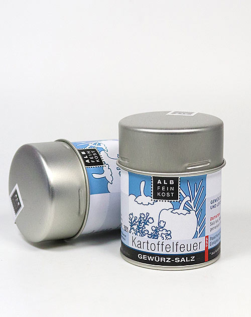 Kartoffelfeuer Gewürz-Salz von der Schwäbischen Alb. Genießen Sie ein Gewürzsalz mit dezenter Schärfe und leicht süßer Note. Passt ganz hervorragend zu “wilden” Kartoffeln, Bratkartoffeln, Eintöpfen, würzigen Geflügel-, und Linsengerichten.