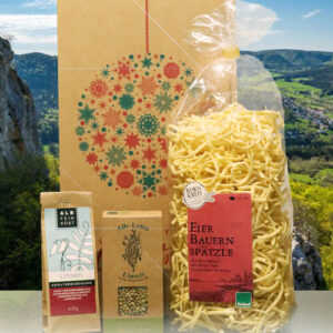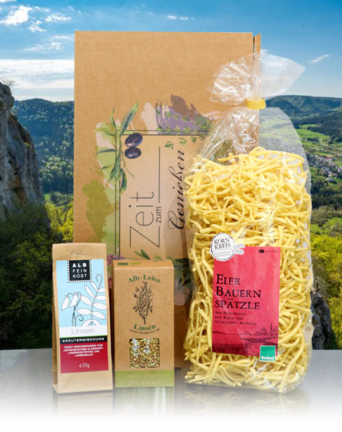 In unserem Präsentset finden sich 250g Alb-Leisa Linsen “Die Kleine” (Presidio Alblinse), 500g Kornkreis-Eierspätzle und 20g Kräutermischung von Alb-Feinkost. Alle Komponenten sind BIO-zertifiziert und von bester Qualität. So steht dem schwäbischen Genuss nichts mehr im Weg. Viel Freude beim Verschenken oder guten Genuss beim Ausprobieren!