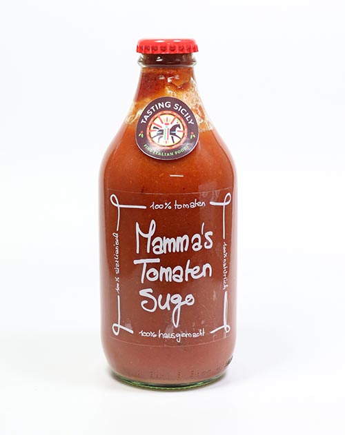 Mamma’s Tomatensugo wird in Handarbeit nach Mamma’s Art aus lokalen, sonnenreifen sorgfältig verlesenen Tomaten hergestellt, in grossen Töpfen aufgekocht, durch den Passata pomodoro getrieben und bis zur optimalen Konsistenz zum sofortigen Gebrauch reduziert. In die typisch italienischen Bottiglie abgefüllt, verschlossen und sterilisiert behält der Sugo sein unverkennbar süditalienisches „Profumo“. Durch die Verwendung von sonnengereiften, lokal kultivierten Tomaten können sie zum optimalen Reifezeitpunkt (ca. Ende August) gelesen und gleich verarbeitet werden. So kann auf die Zugabe von Zucker verzichtet werden, weil die Tomaten durch den richtigen Erntezeitpunkt kaum mehr Säure enthalten.