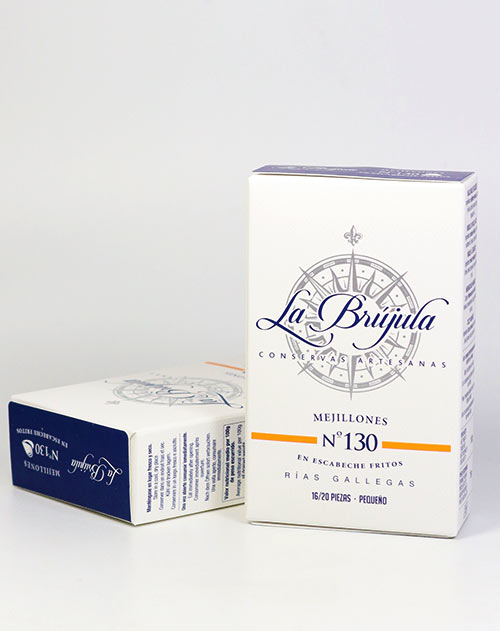 Miesmuscheln DOP in Marinade - Mejillones en Escabeche fritos No.130, 110g/76gMiesmuscheln DOP in Marinade – Mejillones en Escabeche fritos No.130, 110g/76g
