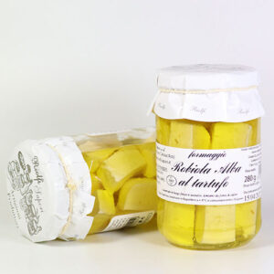 Der Robiola d´Alba ist eine typische Käsespezialität aus der Provinz Cuneo (Piemont). Der aus Kuhmilch hergestellte Käse wird in Würfel geschnitten, gewürzt und in einem Glas mit bestem Olivenöl eingelegt. Unser Formaggio Robiola d´Alba al tartufo mit schwarzem Trüffel passt hervorragend zu Vorspeisen, Hauptgerichten und zur traditionellen, mediterranen Käseplatte nach dem Essen oder genießen Sie ihn einfach auf geröstetem Brot.