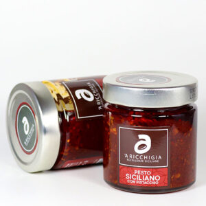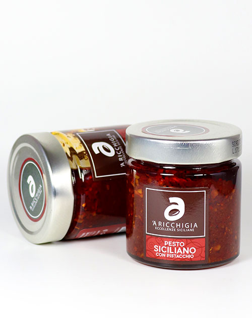 Ein herzhafter Genuss für Pistazienfreunde aus nur drei Zutaten! Das Pesto Siciliano von 'A Ricchigia hat dank seines hohen Anteils an Pistazien einen unverwechselbaren Geschmack. Genießen Sie dieses Pesto zu einer al dente gekochten italienischen Pasta und träumen Sie sich auf das sonnige Sizilien.