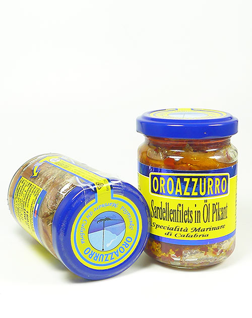 Die pikanten Sardellenfilets (lat. Engraulis Encrasicolus) aus Kalabrien haben ihr herrliches Aroma nicht zuletzt den verwendeten Chilischoten zu verdanken. Eingelegt sind sie in bestem Sonnenblumenöl. Hergestellt wird die italienische Fisch-Spezialität unter der Marke Oroazzuro – Specialitá Marinare di Calabria in dem traditionsreichen Produktionsbetrieb der Firma Calabraittica im kalabrischen Anoia.