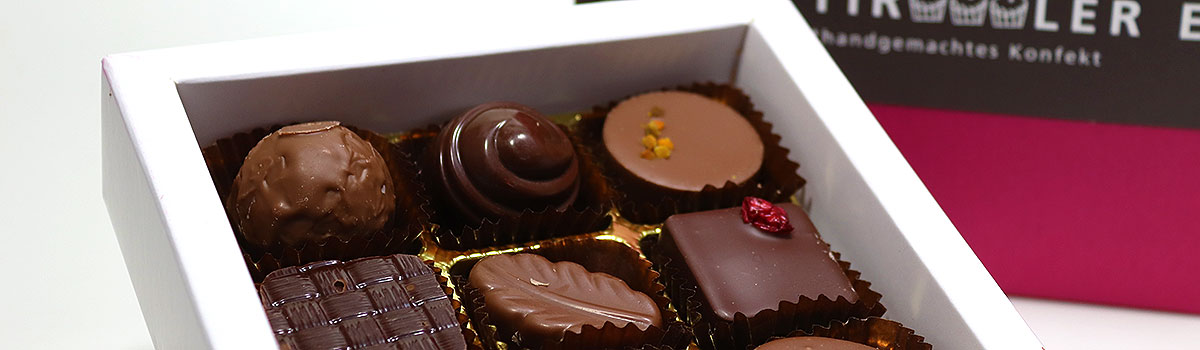 Tiroler Edle, handgemachte Pralinen von Chocolatier Hansjörg Haag aus Tirol.