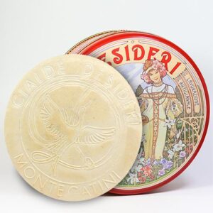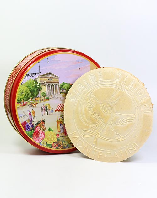 Familie Desideri bietet ihre knusprigen Mandelwaffeln in drei verschiedenen Größen und Formen an. Diese hier erwarten Sie in einer schönen Zierdose mit einem Motiv aus dem historischen Montecatini. Der Durchmesser von diesen Waffeln ist ca. 16 cm.